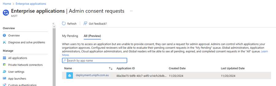 Consent the application: under Activity, go to Admin consent requests, you may need to go to the All tab.