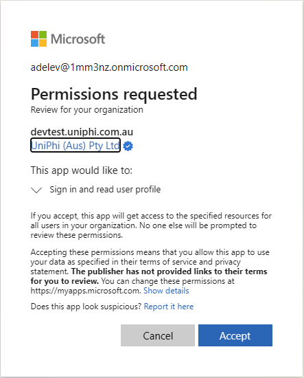 Log into UniPhi using Microsoft, when the Permissions requested screen appears, enable Consent on behalf of your organisation to allow for other users, then click Accept.